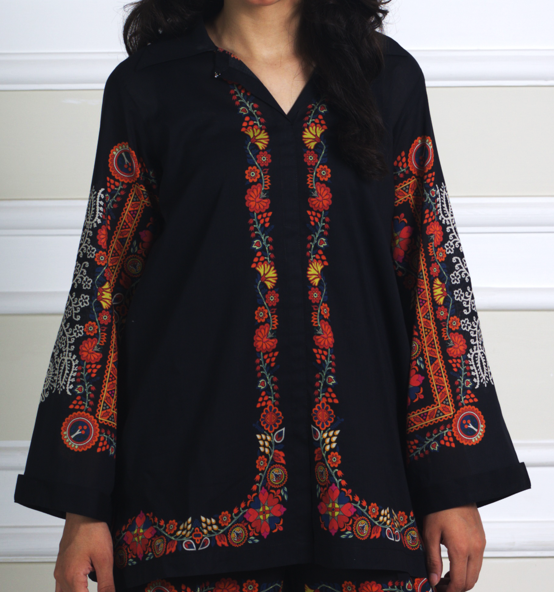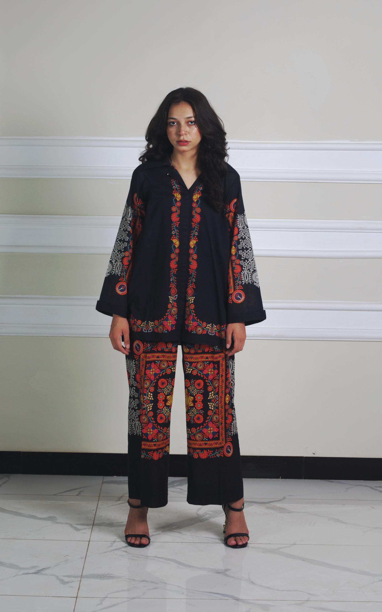 heritage-inspired motifs in rich reds, oranges, and gold. The intricate print on the front panel, cuffs, and trouser hems gives the luxurious illusion of traditional embroidery.