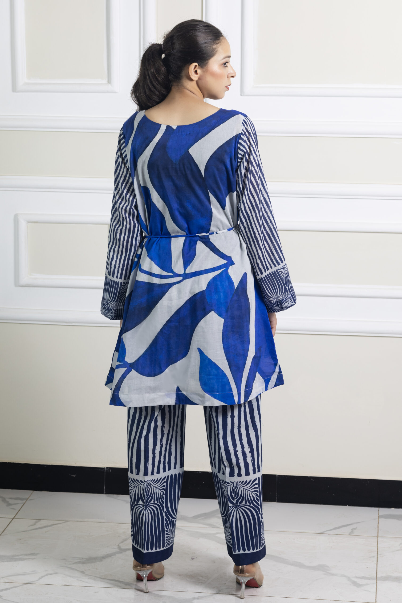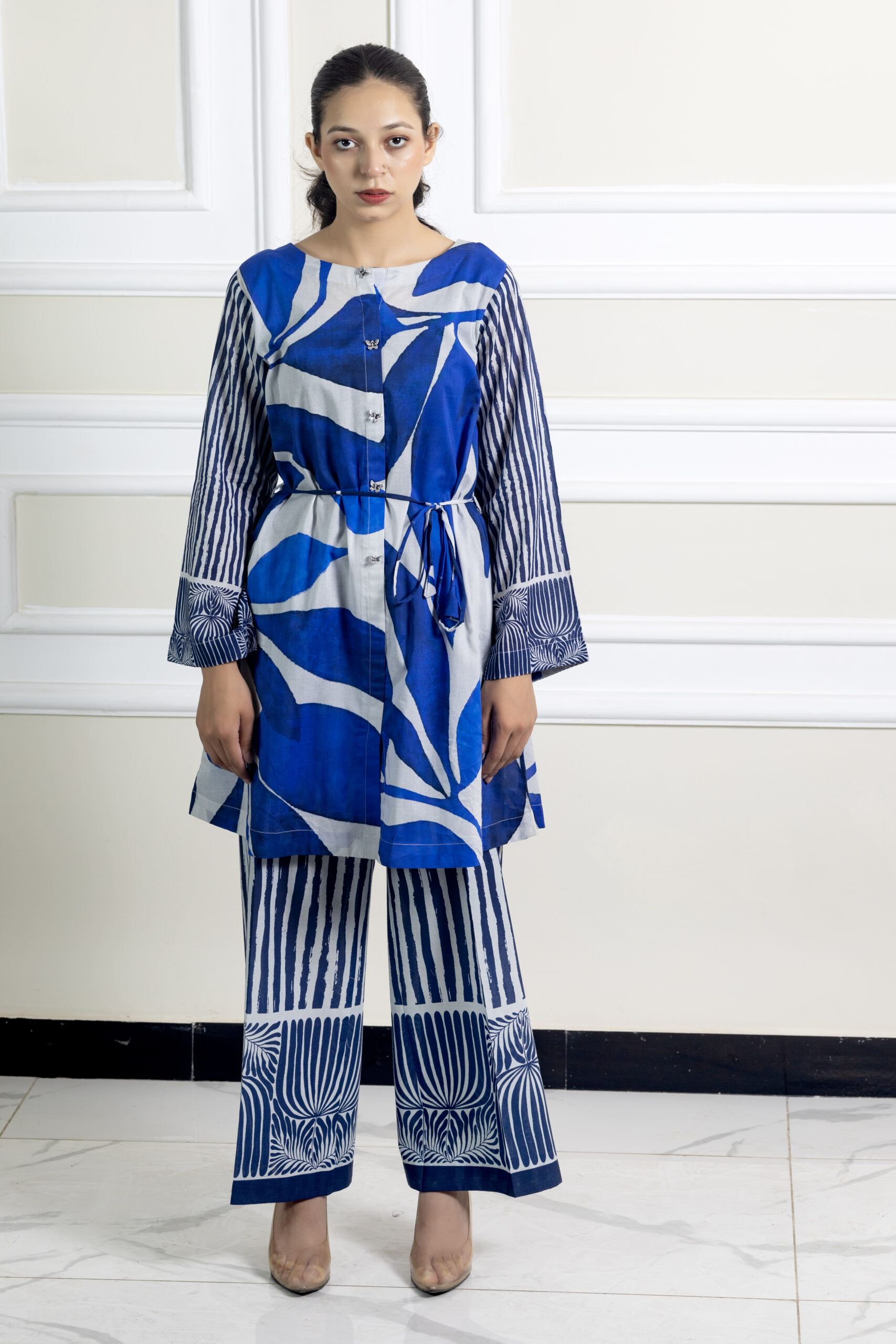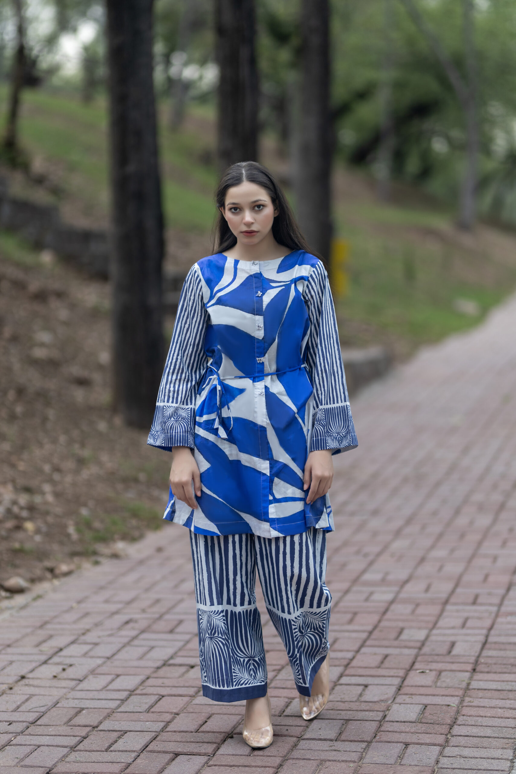 cobalt blue and white abstract print on premium, breathable lawn fabric, ensuring you look effortlessly chic while staying cool. The unique design masterfully combines the bold abstract motif with elegant pinstripe detailing on the sleeves, giving the outfit a modern, tailored finish.