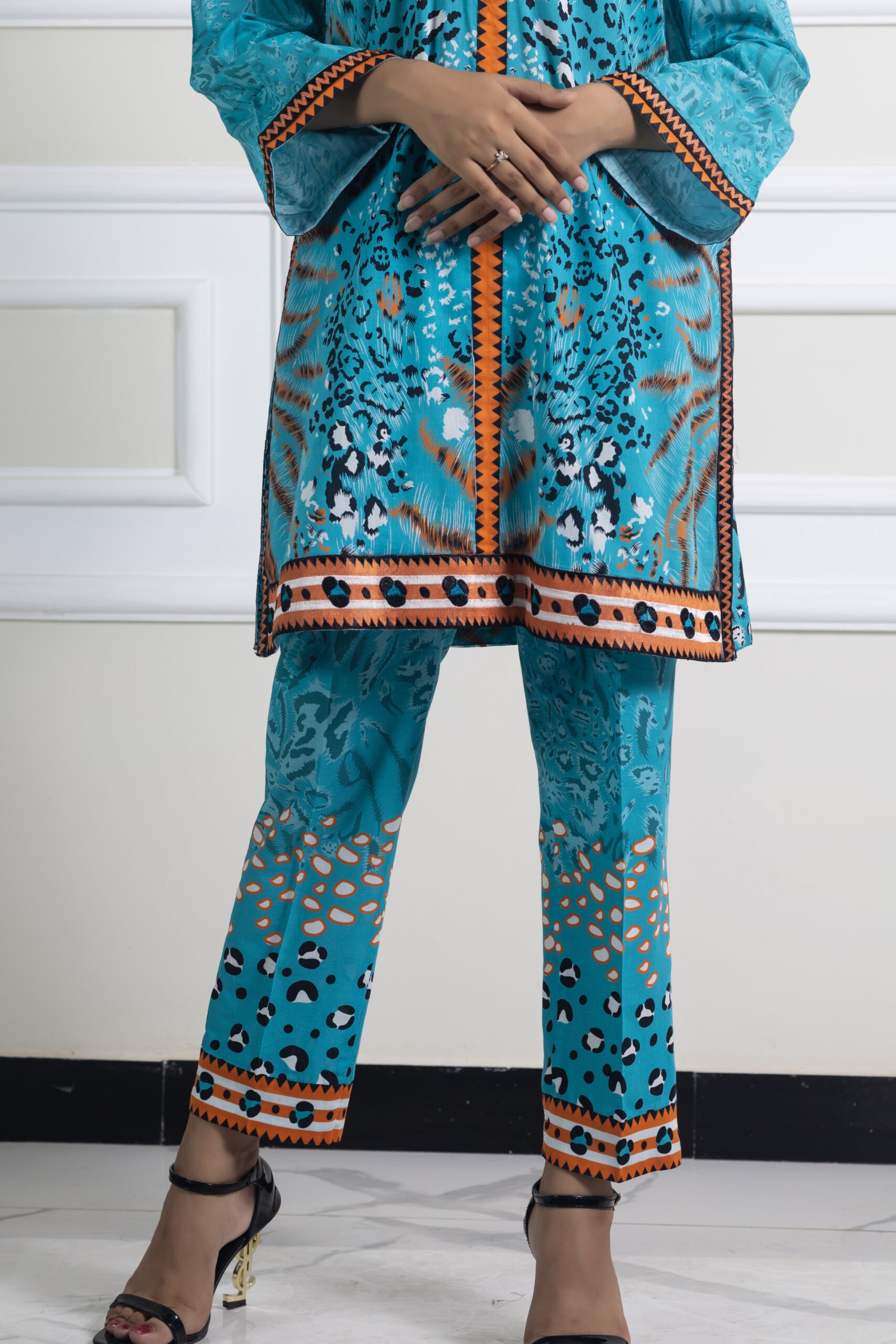 2 Piece Luxury Printed Lawn – Turquoise & Orange Ethnic Stitched Suit for Women