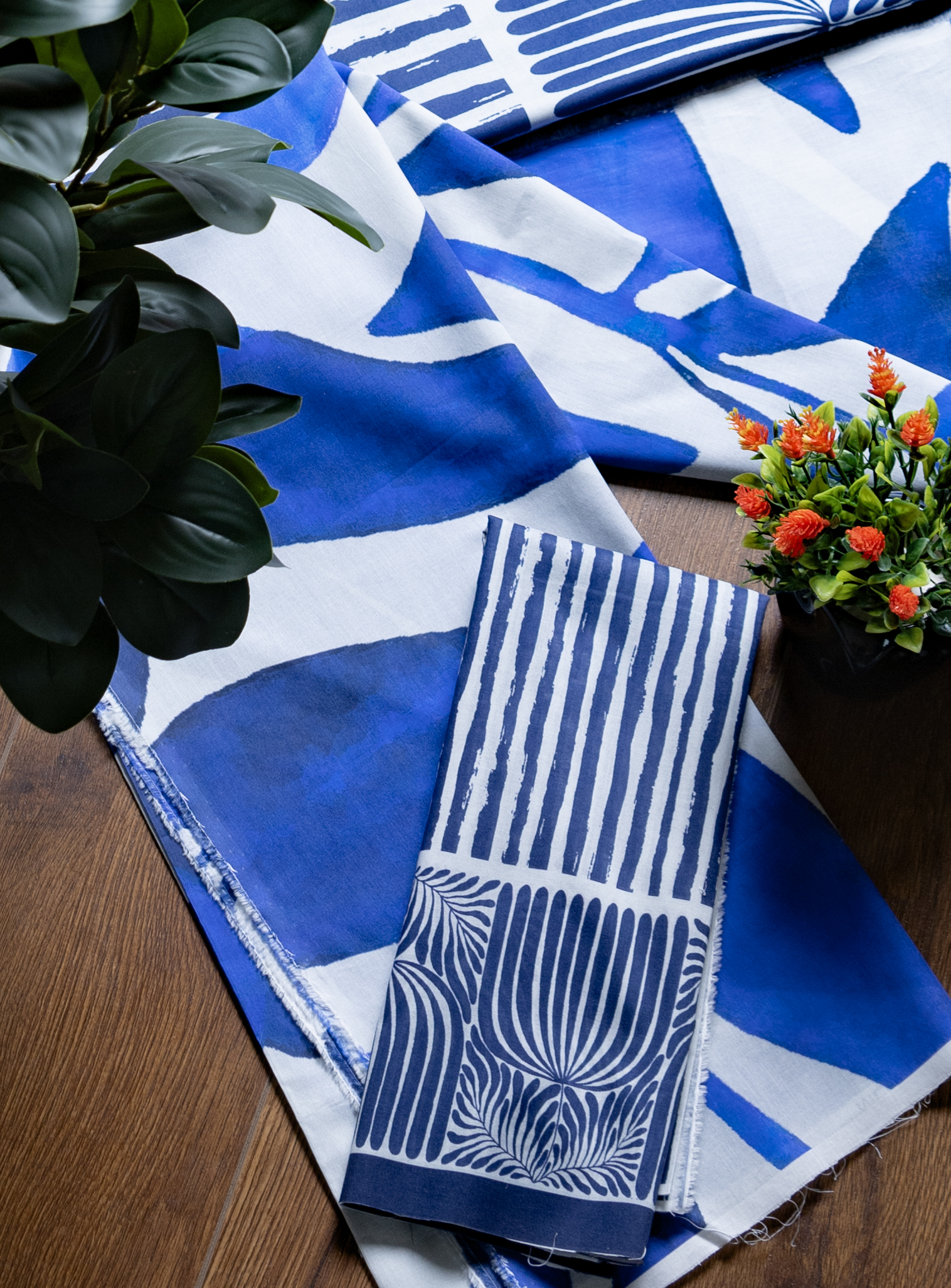 Description: Make a vibrant and artistic statement with the Meri Lado 2 Piece Luxury Printed Lawn Unstitched Suit Fabric. This striking design features a bold cobalt blue and crisp white palette, showcasing large-scale abstract patterns fused with intricate vertical stripes. It's a truly modern and captivating print that offers a fresh take on summer style. Crafted from premium, soft lawn fabric, this material is wonderfully lightweight and supremely breathable, making it the perfect choice for a custom-tailored outfit for warmer days. The two-piece set includes ample printed shirt fabric and coordinating trouser fabric, both adorned with the distinctive, high-quality Meri Lado prints. Design your perfect ensemble for casual outings, resort wear, or a unique statement piece that reflects your contemporary fashion sense.