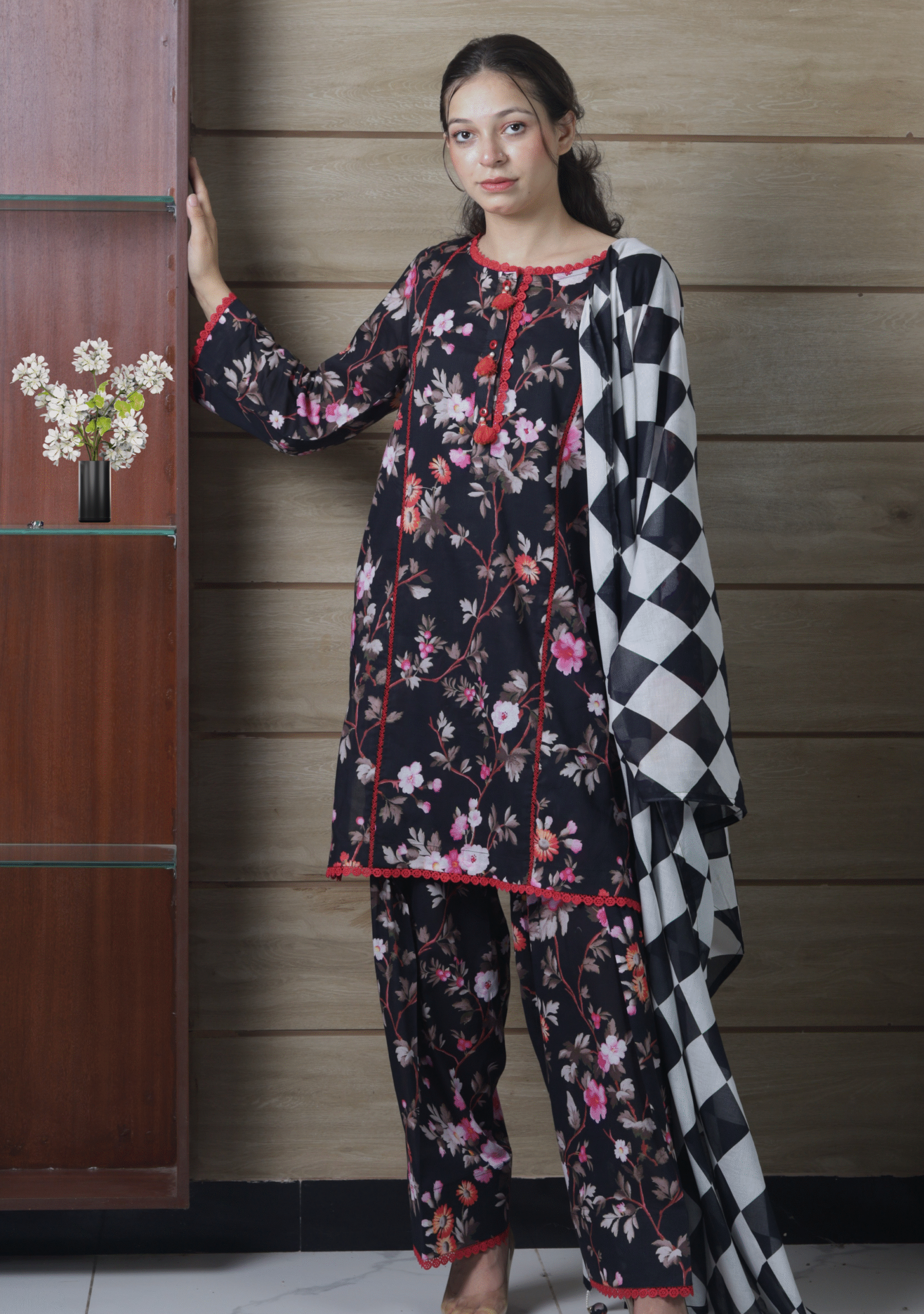 Meri Lado 3 Piece Luxury Printed Lawn Suit. This ensemble features a rich