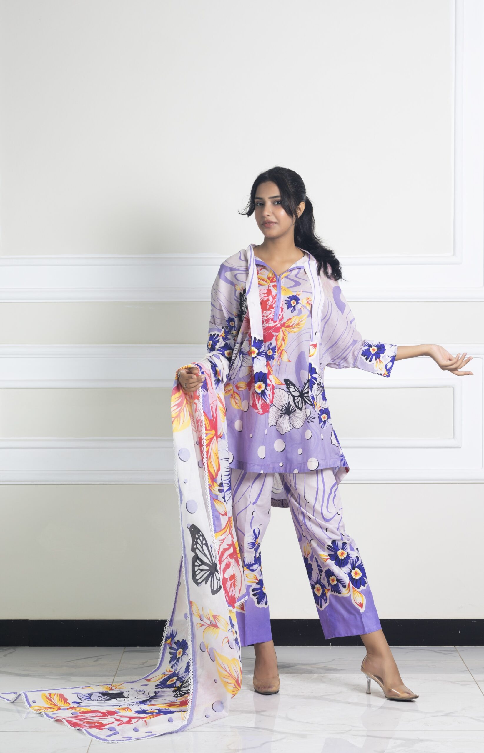 printed lawn dupatta. The dupatta features a striking large butterfly print and contrasting borders, adding an artistic flourish. Ideal for garden parties, Eid celebrations, or simply adding a touch of feminine charm to your everyday, this